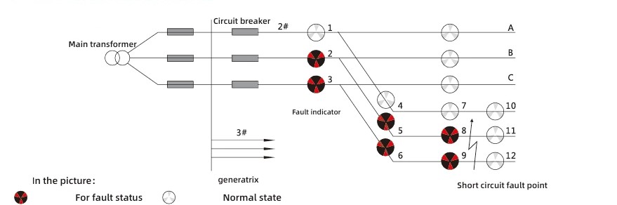 Въз основа на характеристиките на явленията на късо съединение, внезапната промяна на тока по време на късо съединение, придружена от прекъсване на захранването на защитното устройство, се използва като критерий за действие. Методът за тълкуване на диаграмата за индикация на неизправност е следният: Когато индикаторни светлини 2, 5 и 8 на фаза A на линия 2, няма индикаторна светлина на фаза B, всички индикаторни светлини 3, 6 и 9 на фаза C светят в червено, докато индикаторните светлини 11 и 12 остават бели, може да се определи, че е възникнала повреда на късо съединение в тази точка на изходящата линия.
